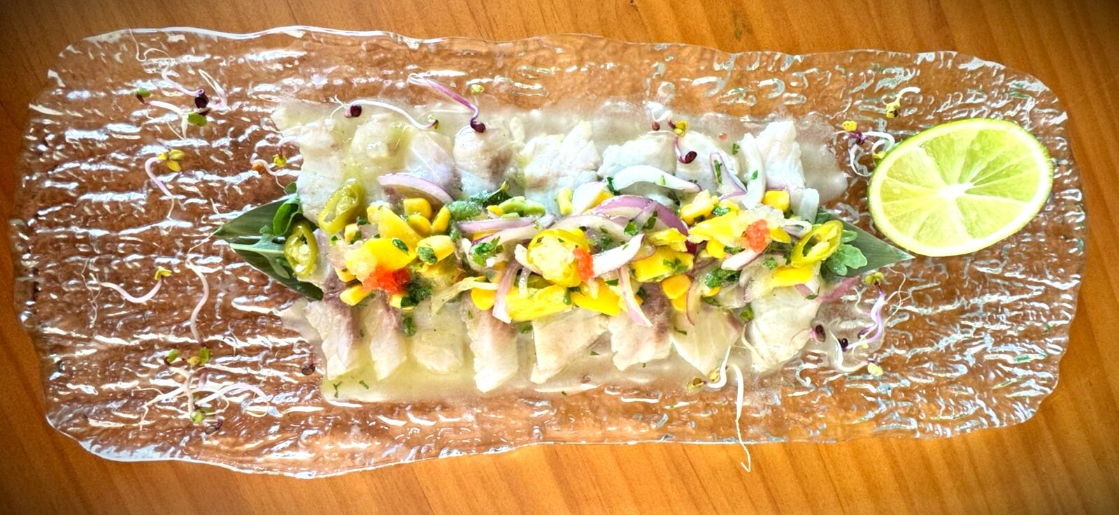 aguacate, cebolla morada, pimientos, maíz, cilantro, leche de tigre y zumos de cítricos valencianos y pomelo. Picante al gusto (tabasco)